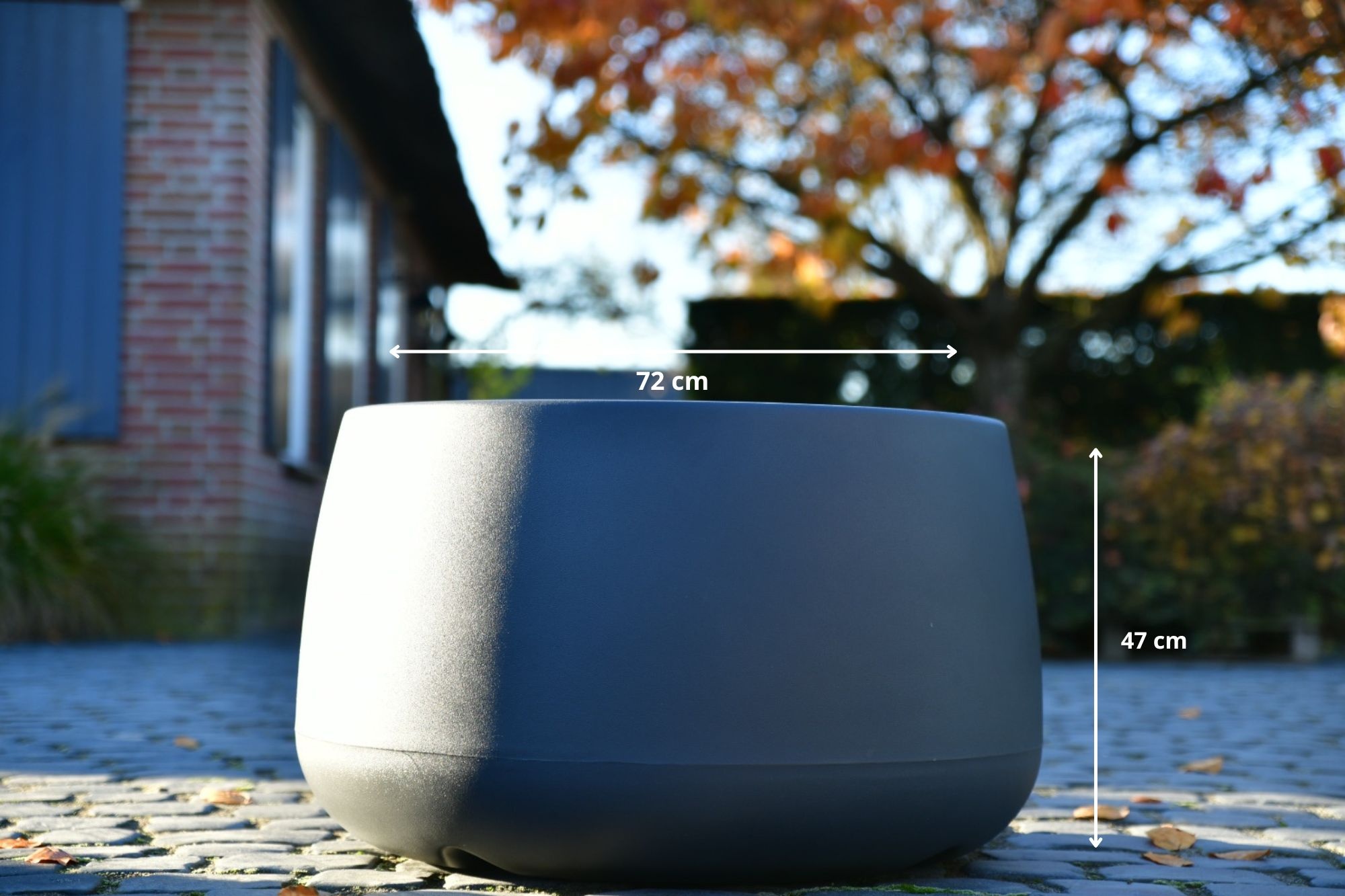 De plantenbak Koert heeft een buitenmaat diameter van 72 cm en een binnenmaat diameter van 62 cm. De bak is 47 cm hoog, op zijn breedste punt is hij 80 cm breed en de inhoud van de plantenbak Koert is 195 liter.